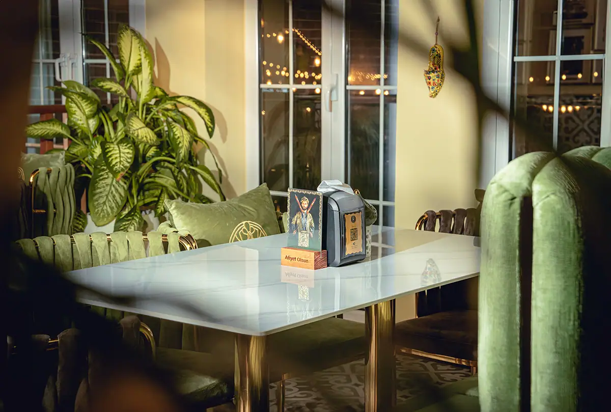 Turkish proverbs and calligraphy appear subtly across tiles and wall frames. Patterns from historic palaces were reimagined as wallpaper accents. Even the uniforms of the staff were chosen to match the ambiance and tone of the environment.
